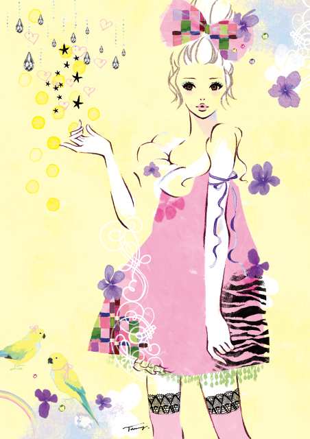 Born in Tokyo in 1979. Graduated from Bunka Fashion School.Started activities as a freelance illustrator in 2003.She draws girls who are colorful and shining brightly on the theme of being Cute, POP, and Stylish.Using a brilliant drawing style, she is very active in various kinds of media including websites, mobile phones, magazines, books, and ads.